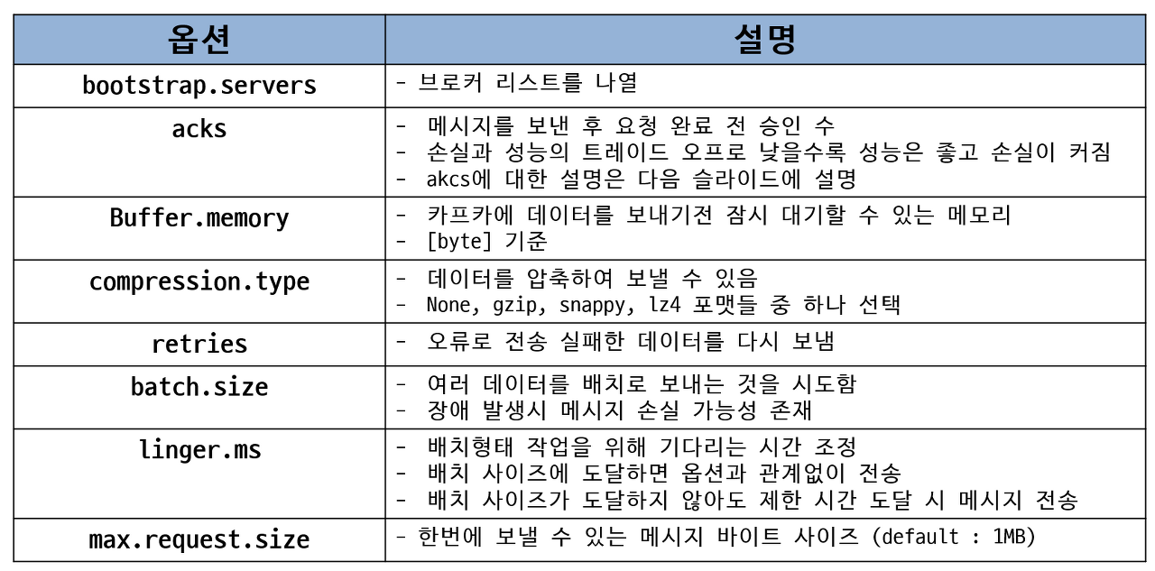 Producer를 구성할때 여러가지 옵션들을 고려할 수 있는데 아래와 같이 구성되어 있으니 참고해서 추가한다.