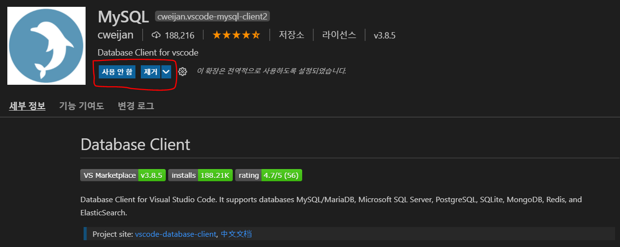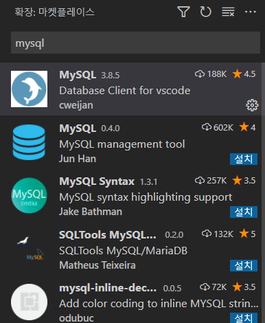 2. Extention 항목에서 Mysql을 검색하여 다음과 같은 확장을 설치 한다.