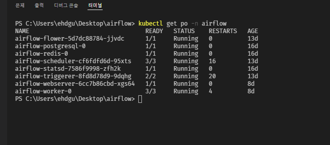 설치된 Helm의 이름은 airflow이며 이 Helm Chart를 통해서 설치되는 위치는 새로 생성한 airflow namespace에 설치됩니다.
