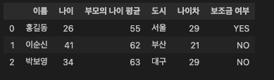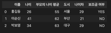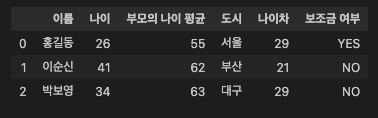 df["보조금 여부"] = df.apply(lambda subsidy: "YES" if subsidy["도시"] == '서울' and subsidy["나이차"] >= 25 else "NO", axis=1)