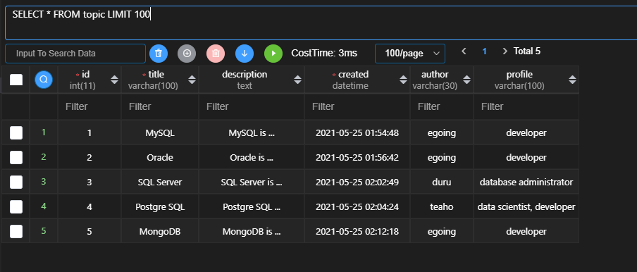 insert into topic (title,description,created,author,profile) values('MongoDB','MongoDB is ...',now(),'egoing','developer');