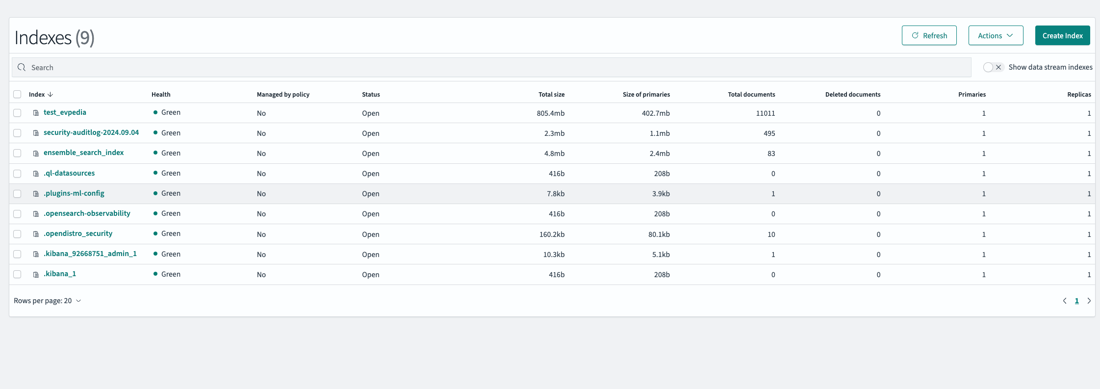 그럼 다음과 같은 index목록이 나타나고, 우측 상단에 create index를 눌러서 인덱스를 생성해 줍니다. 저는 이미 생성 했고, 제가 개발하고 있는 evpedia의 이름을 가진 index가 보이네요 ㅎㅎ