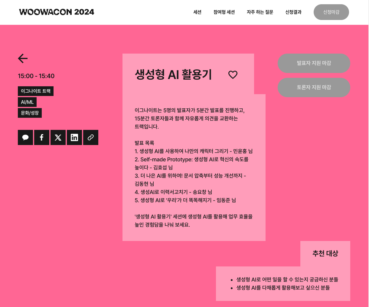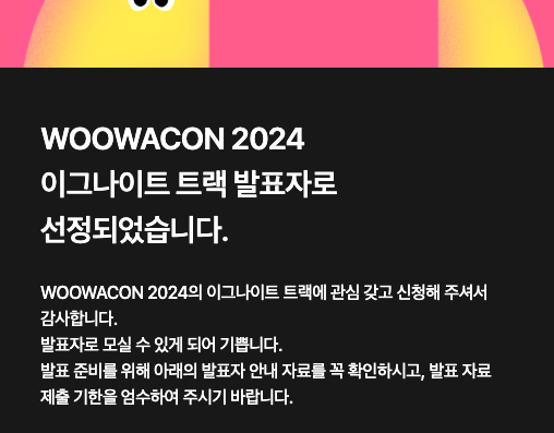 최근에 LLM을 활용한 전기차 정보 제공 서비스를 만들고 있는데, 동료 PM으로부터 메시지를 받았습니다. 우아콘을 10월 30일 날 진행하니 신청해 보라는 것이었고, 내부 내용을 살펴보니 이번에는 참여형 세션이라고 해서 외부 인물도 발표를 할 수 있는 세션이 있다는 것을 알게 됐습니다. 그래서 고민 한.. 0.1 그람쯤 하고, 설마 되겠어라는 생각으로 작성한 참가 신청을 했습니다.