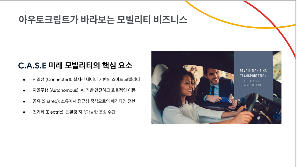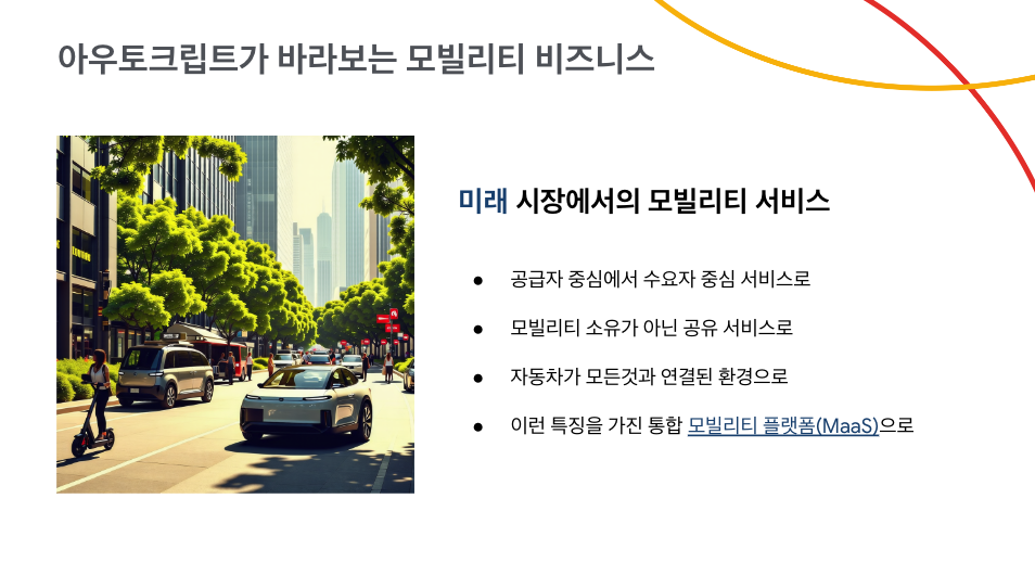 어느정도 발표의 가이드라인이 주어졌는데요, 모빌리티 사업의 동향을 우리 회사의 관점에서 해석하는 파트와 -> 그래서 우리는 지금 어떤 일을 하고 어떤 미래를 그리고 있는지 -> 그래서 현재 어떤 제품으로 시장에 접근하고 있는지 순서로 발표를 구성했습니다. 그러다 보니 자연스럽게 큰 주제로 연결됐고 마침 다행히도 회사의 제품들이 이런 큰 주제들과 연관이 있어 자료를 쭉 작성하게 됐습니다.