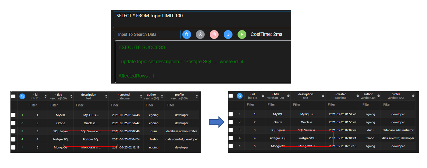 UPDATE topic SET description = 'Postgre SQL ...' WHERE id=4